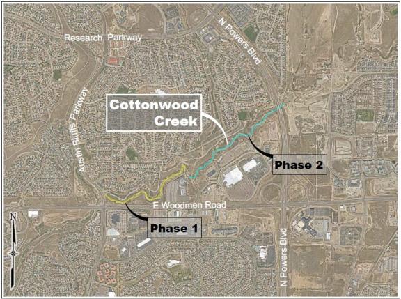 Cottonwood Creek at the intersection with Powers Blvd (just north of the Powers Blvd. and Woodmen Road Intersection) going west (downstream) about 4,000 feet behind the Academy School District 20 bus barn.