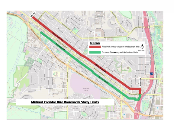 This project is derived from the Midland Corridor Study that was completed in 2022. The study provided a holistic study of the Midland Corridor area between Walnut Street and 31st. It evaluated the multi-modal transportation vision for the entire area and the role Colorado Avenue could fulfill within the larger area.