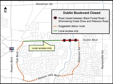 The signed detour route will direct through traffic on Dublin Boulevard to use Tutt Boulevard, Stetson Hills Boulevard and Peterson Road to bypass the work area. Local access will be provided between Tutt Boulevard and Black Forest Road/Shimmering Creek Drive.